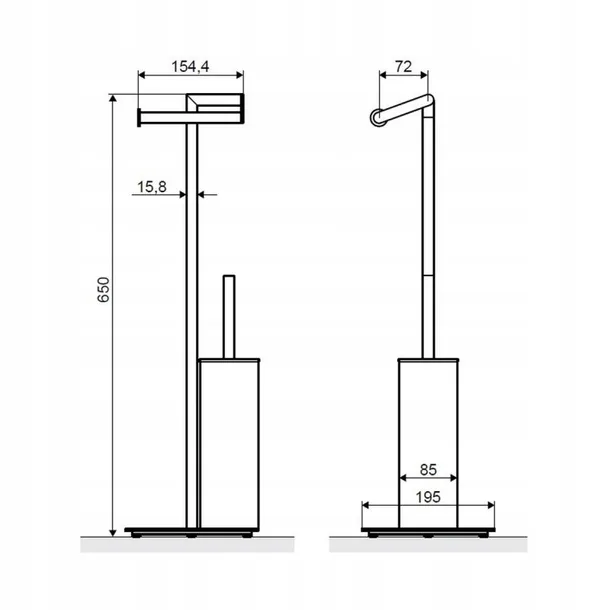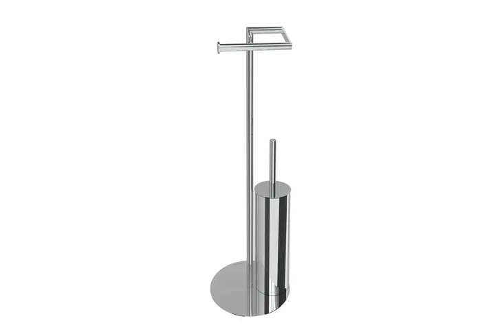Funkcjonalny stojący wieszak na papier toaletowy, zintegrowany ze szczotką do WC, odporny na korozję dzięki specjalnej chromowej powłoce.